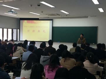 2011级应届毕业生党员谢李敏学姐作为老学员代表发言,她回首了自己的入党历程,并结合PPT将自己学习、工作和生活逐一展现,同时也指出自己当时关于入党的误区,劝勉本期学员要继续努力,把入党看作一个水到渠成的过程,不要为入党而入党。随后,赵亚英老师就党校纪律做了详细介绍,希望大家功夫花在平时,通过党校的学习提高党性修养。