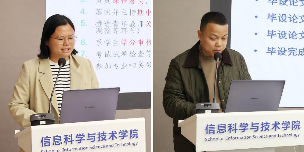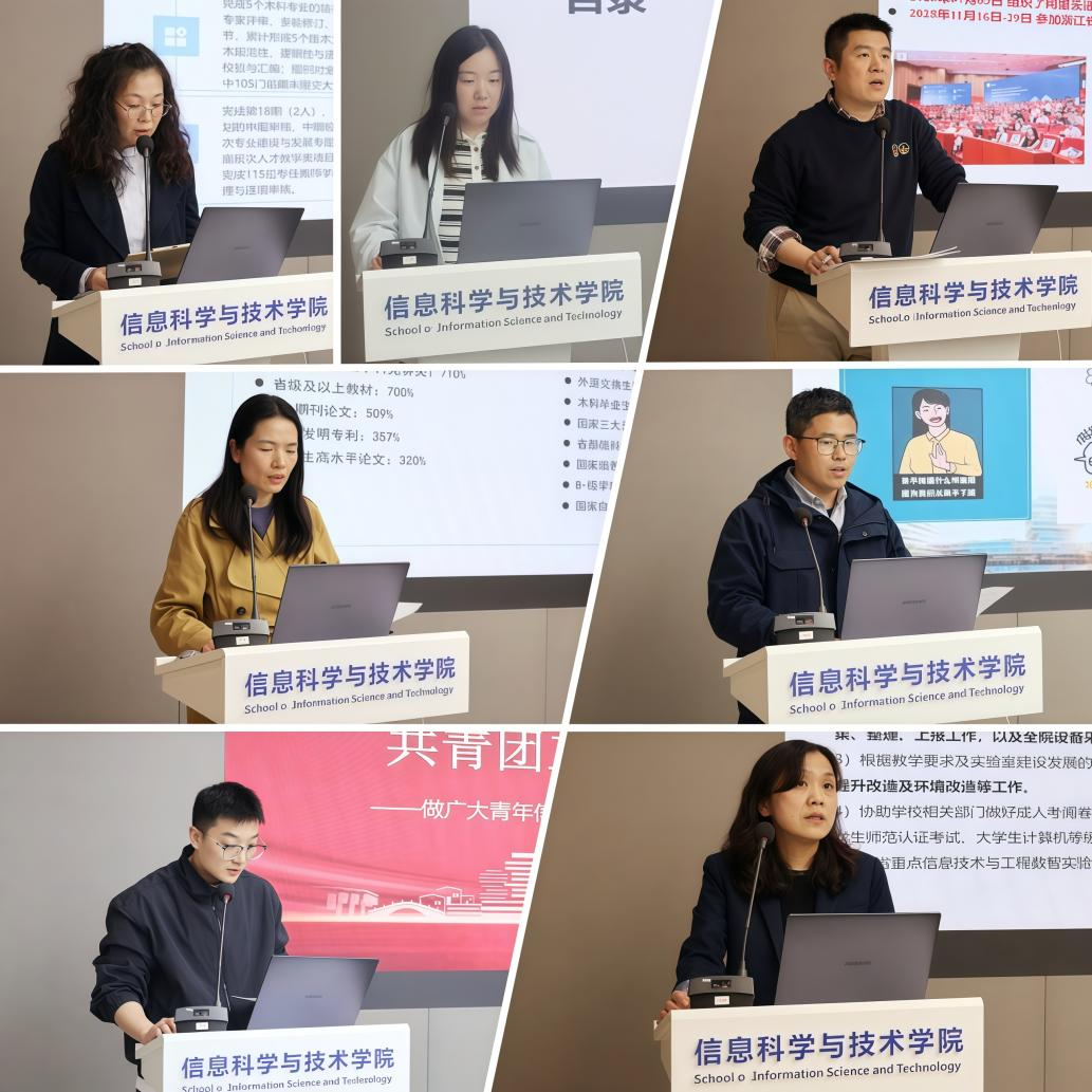 中层干部述职评议环节,计算机与金融信息服务系、软件工程系、电子信息工程系、遥感地学系等系部主任、副主任以及党政办公室、教育国际化办公室、数字化推进办公室、学生工作办公室(团委)、教务科、实验与创新创业管理中心等职能部门主任、副主任依次述职,聚焦教学科研、人才培养、学科建设、学生管理、服务保障等核心工作,全面汇报履职情况、晒出实绩亮点、剖析短板不足,并结合岗位实际提出下一步工作思路与改进举措。述职过程中,大家既展示了计算机学科ESI前1%贡献、国家级竞赛突破、师范专业认证推进、实验室建设升级等标志性成果,也坦诚交流了专业发展、师资引育、课程改革、资源配置等方面的现实难题,现场交流务实深入、氛围浓厚。评委组现场打分、监票计票,确保评议公平公正、规范高效。因事未到现场述职的干部均提交了书面述职报告。