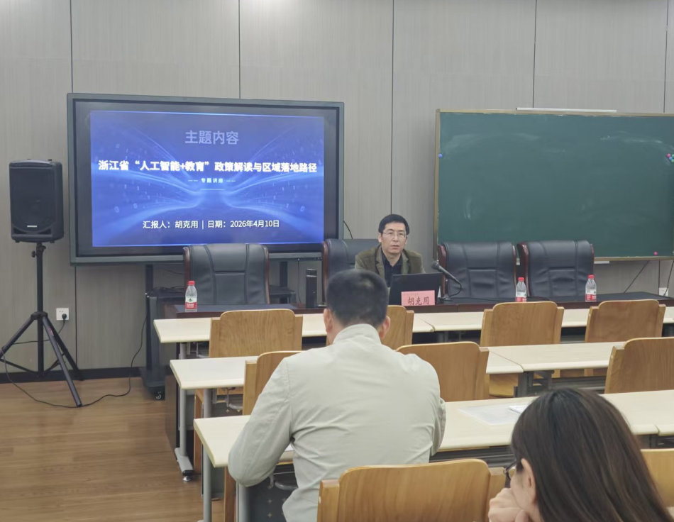 2026年4月10日,应杭州高级中学领导邀请,十大体育博彩公司排名 胡克用老师为该校教师及教育管理者作了题为《浙江省“人工智能+教育”政策解读与区域落地路径》的专题讲座。